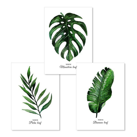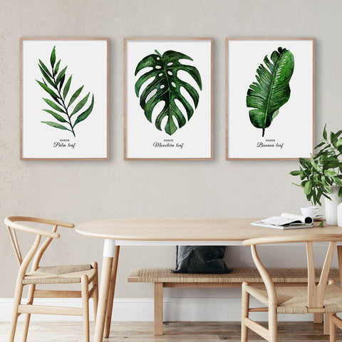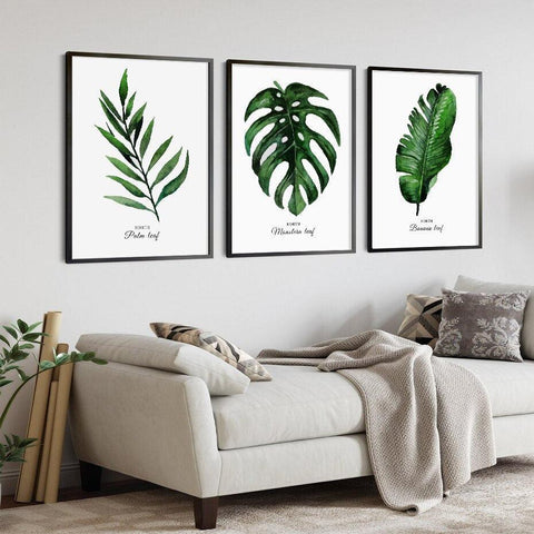 This collection of high-quality canvas prints features three different hand-painted green plant leaves, including the iconic Monstera, Banana, and Palm leaf. Each print captures the intricate details of these iconic leaves, making them the perfect addition to any living space, bedroom or office.